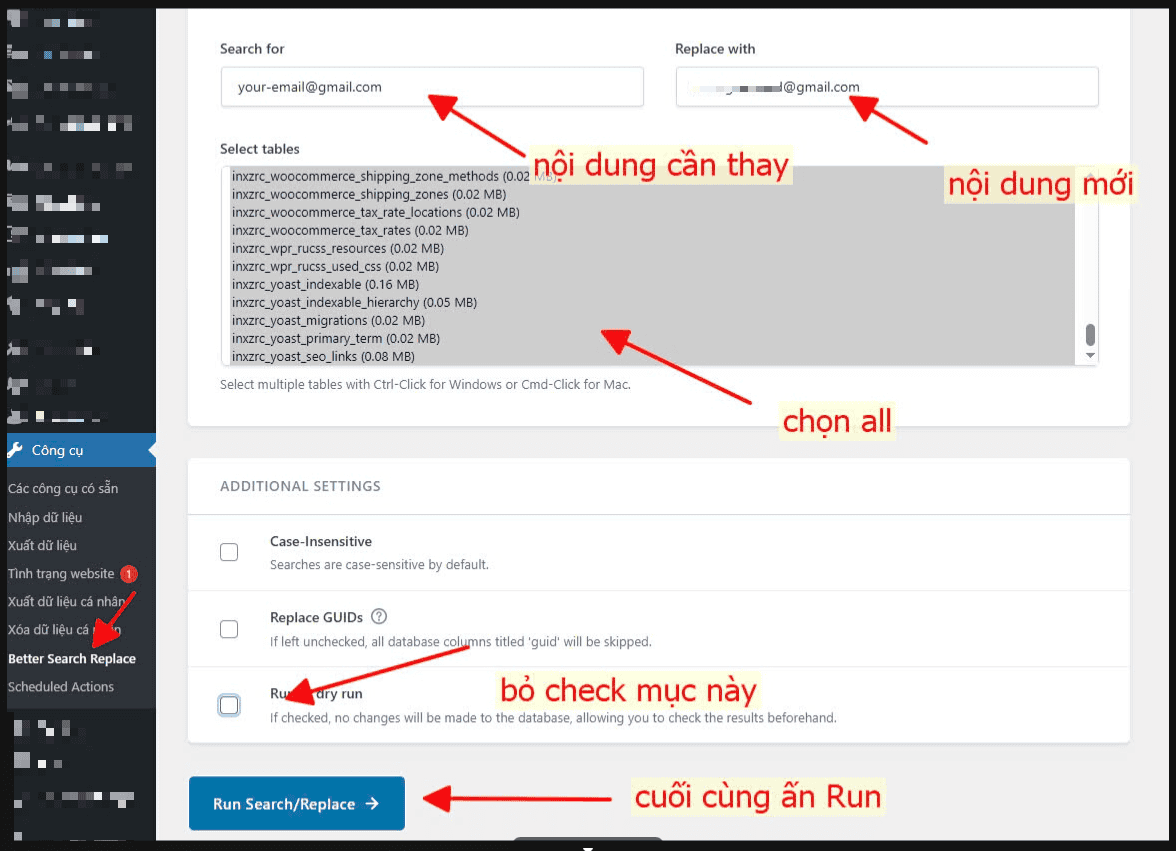Chú ý: Sau khi thực hiện tìm và thay thế xong thì hãy deactive và xóa luôn plugin đi nếu không cần dùng tiếp nhé