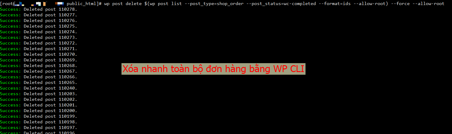 –post_status=wc-completed là trạng thái đơn cần xóa. Nếu muốn xóa nhiều trạng thái thì có thể thêm các trạng thái khác ngăn cách nhau bằng dấu phẩy nhé. ví dụ: –post_status=wc-pending,wc-cancelled