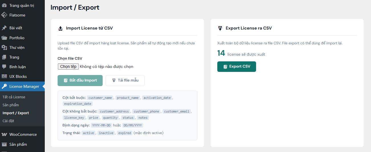 – Export toàn bộ: xuất tất cả license ra file CSV, dùng để sao lưu hoặc import sang site khác