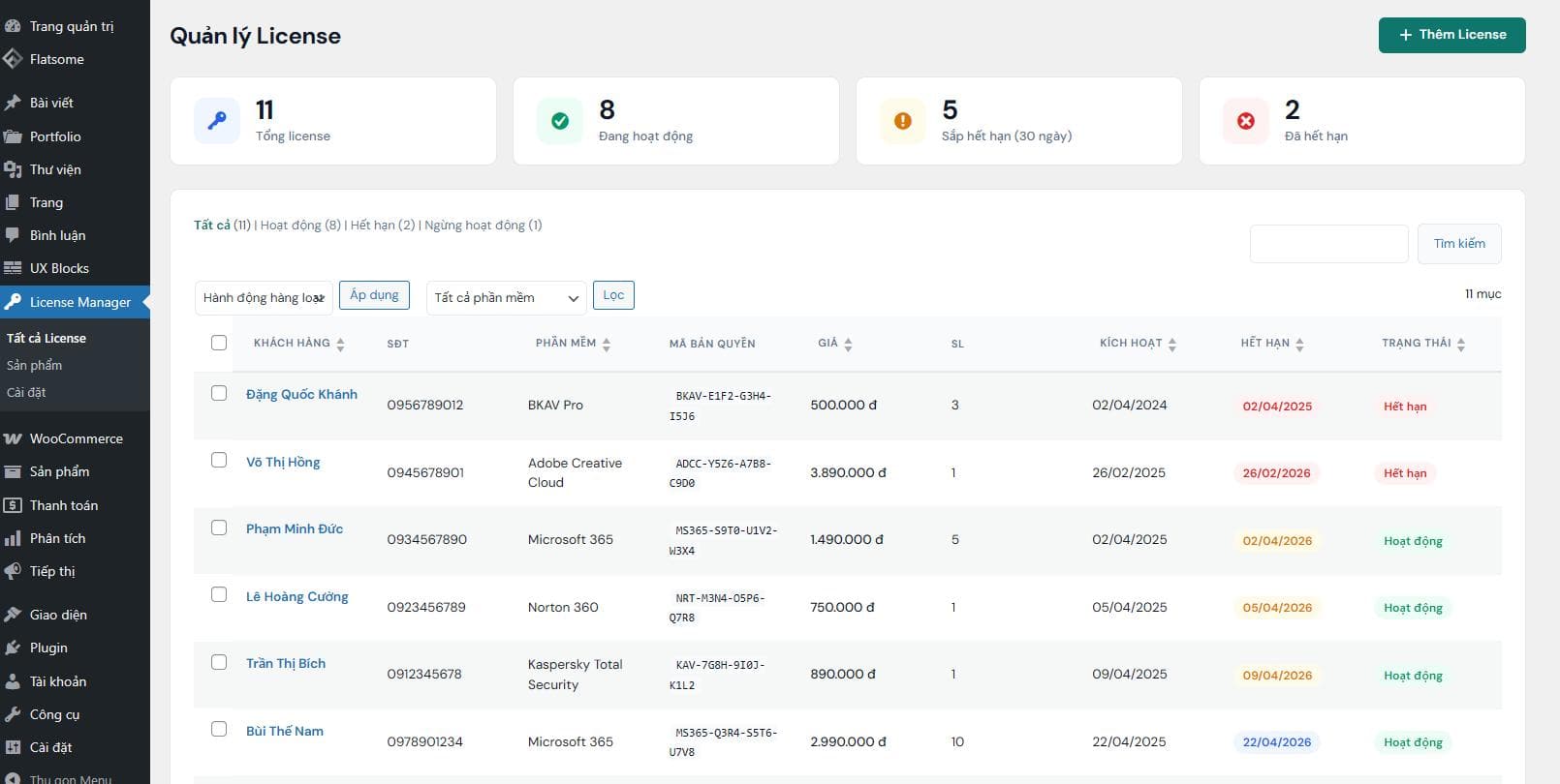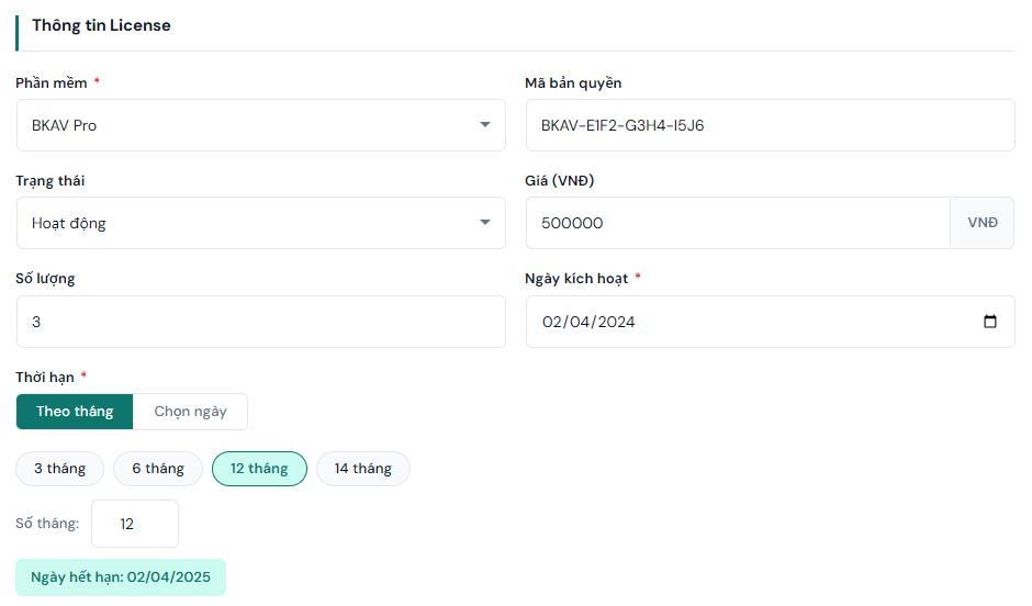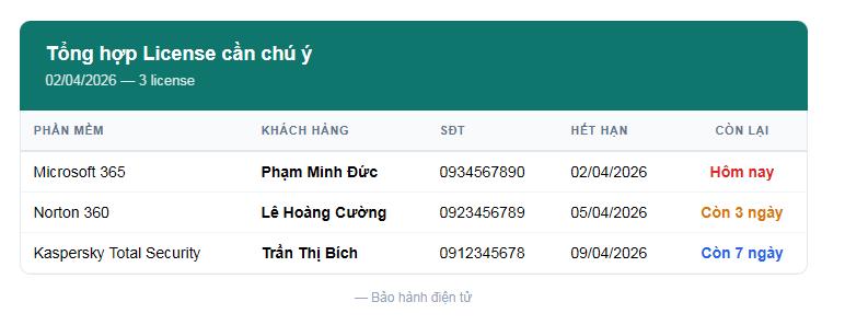 Mỗi license lưu trữ đầy đủ thông tin cần thiết cho việc chăm sóc khách hàng và gia hạn: