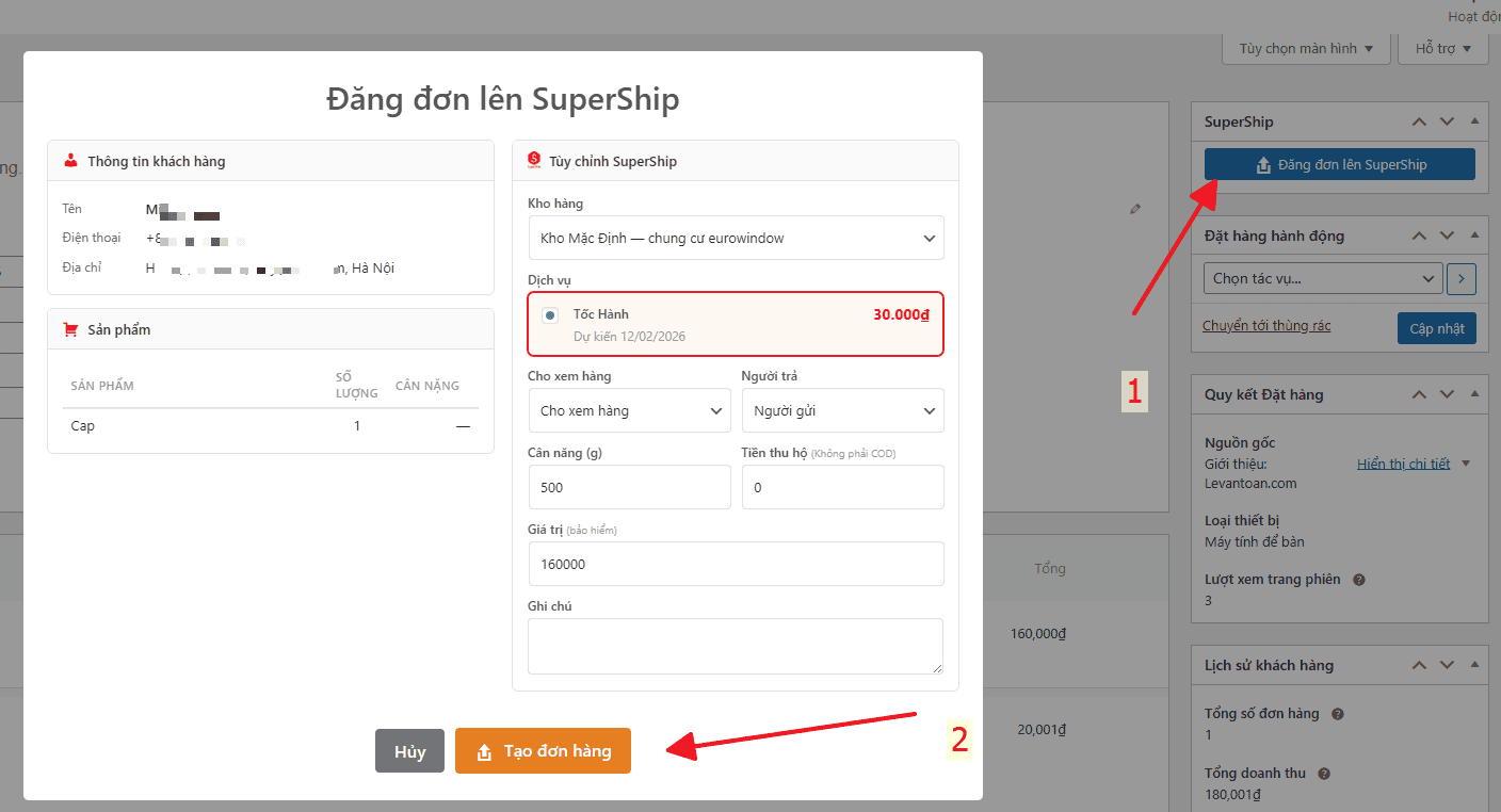 Ngay trong trang chi tiết đơn hàng WooCommerce, bạn sẽ thấy metabox SuperShip với nút “Đăng đơn lên SuperShip”. Click vào sẽ mở popup cho phép bạn: