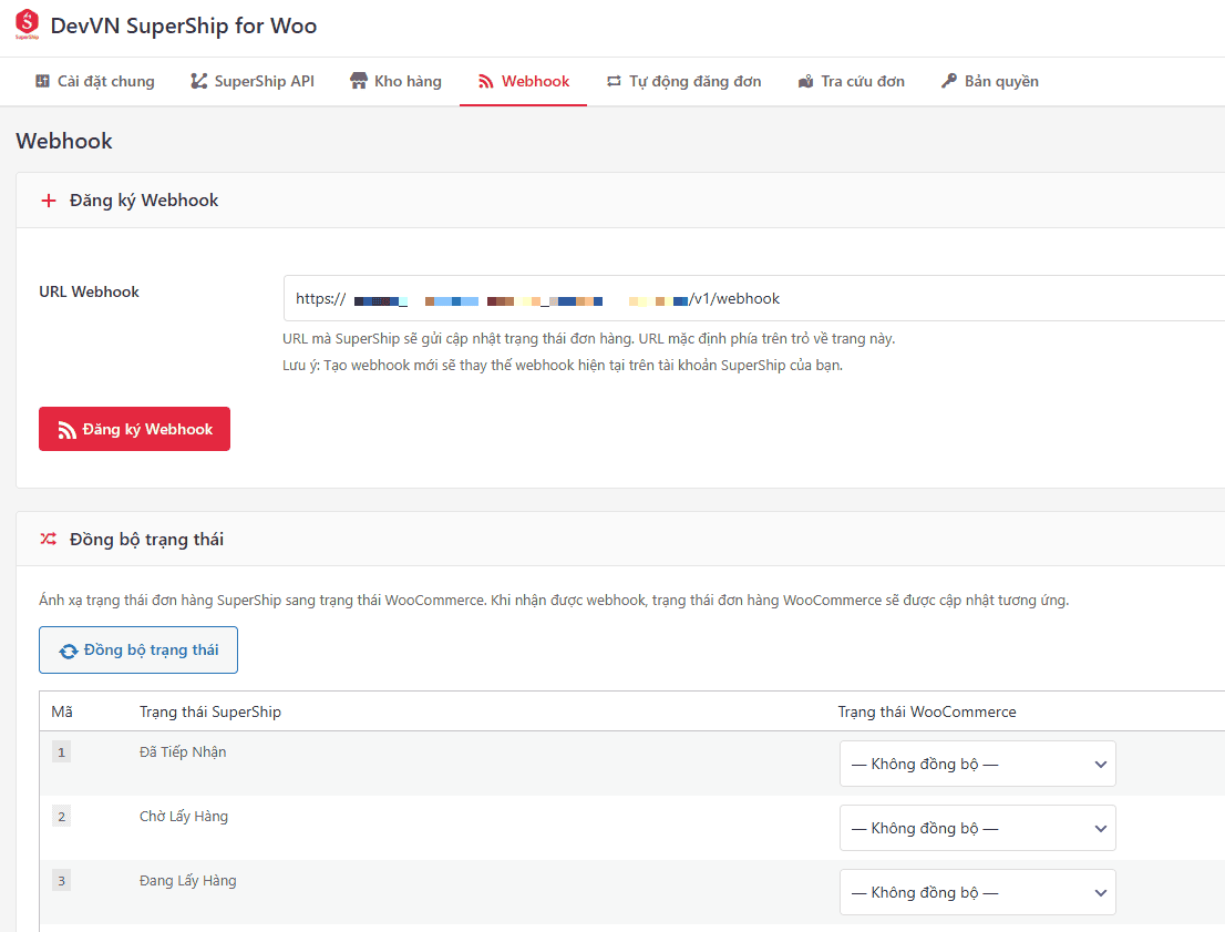 Mọi thay đổi trạng thái trên SuperShip đều được đồng bộ về đơn hàng WooCommerce theo thời gian thực. Bạn chỉ cần vào tab Webhook trong cài đặt plugin, nhấn “Đăng ký Webhook” là xong.