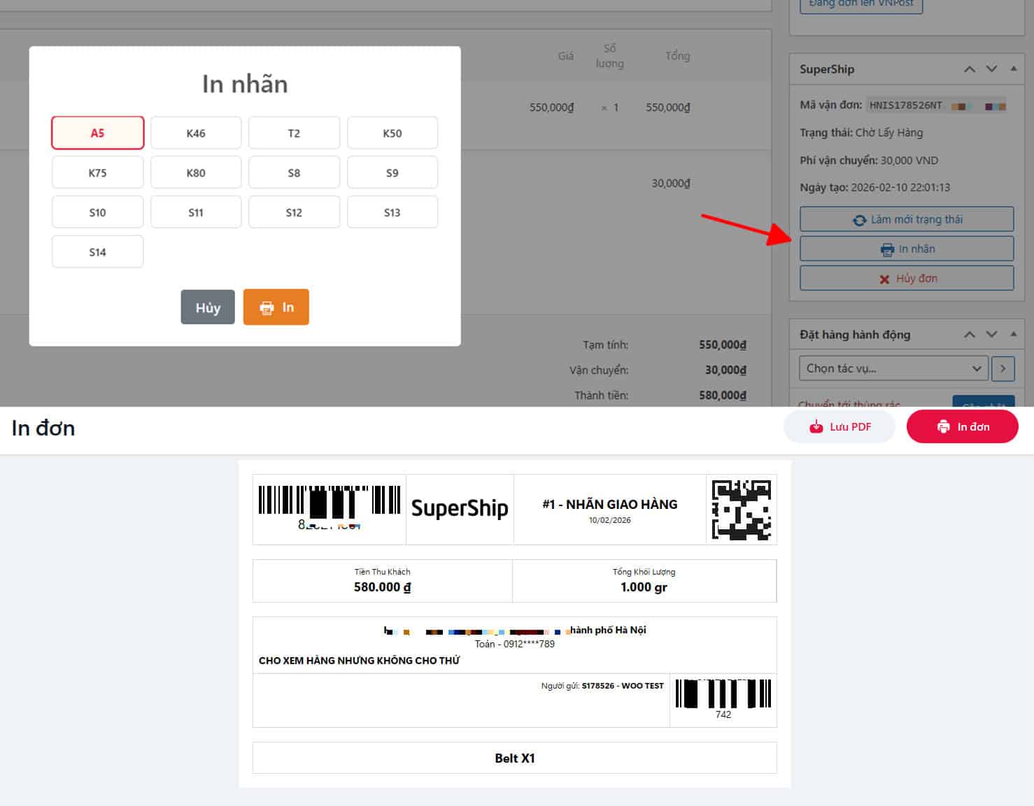 Sau khi đơn được đăng lên SuperShip, metabox trên trang đơn hàng sẽ hiển thị đầy đủ thông tin: