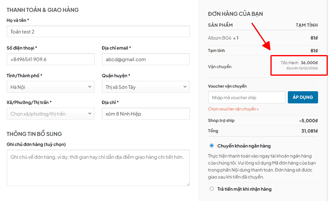 Khi khách hàng nhập địa chỉ giao hàng trên trang checkout, plugin tự động gọi SuperShip API để tính phí vận chuyển chính xác. Phí ship được hiển thị theo từng loại dịch vụ (Tốc Hành, Nhanh, Tiêu Chuẩn) kèm theo thời gian giao hàng dự kiến. Khách hàng chỉ cần chọn dịch vụ phù hợp và thanh toán – không có phí ẩn, không có bất ngờ.
