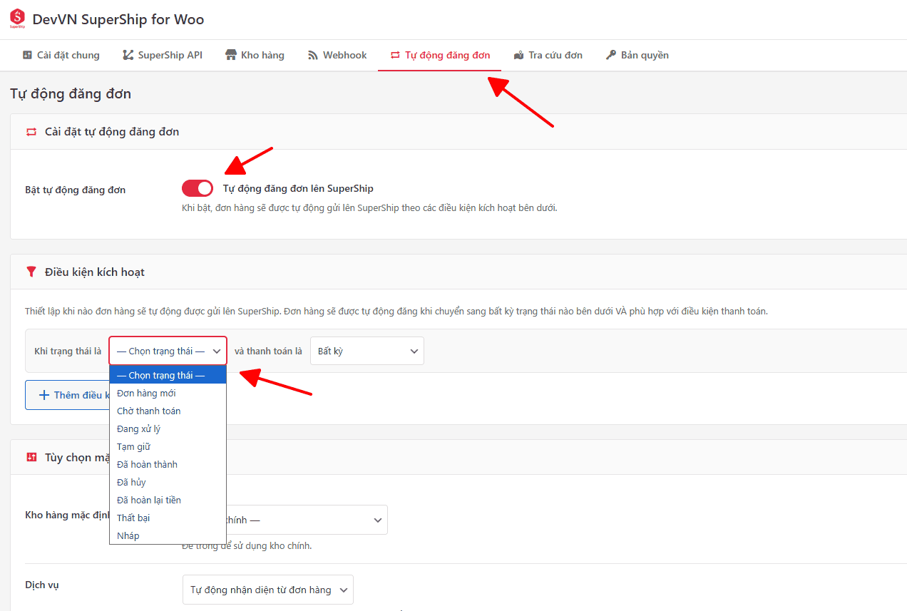 Không muốn tạo đơn thủ công? Bật tính năng Auto Create và để plugin làm việc thay bạn. Bạn có thể thiết lập nhiều điều kiện kích hoạt: