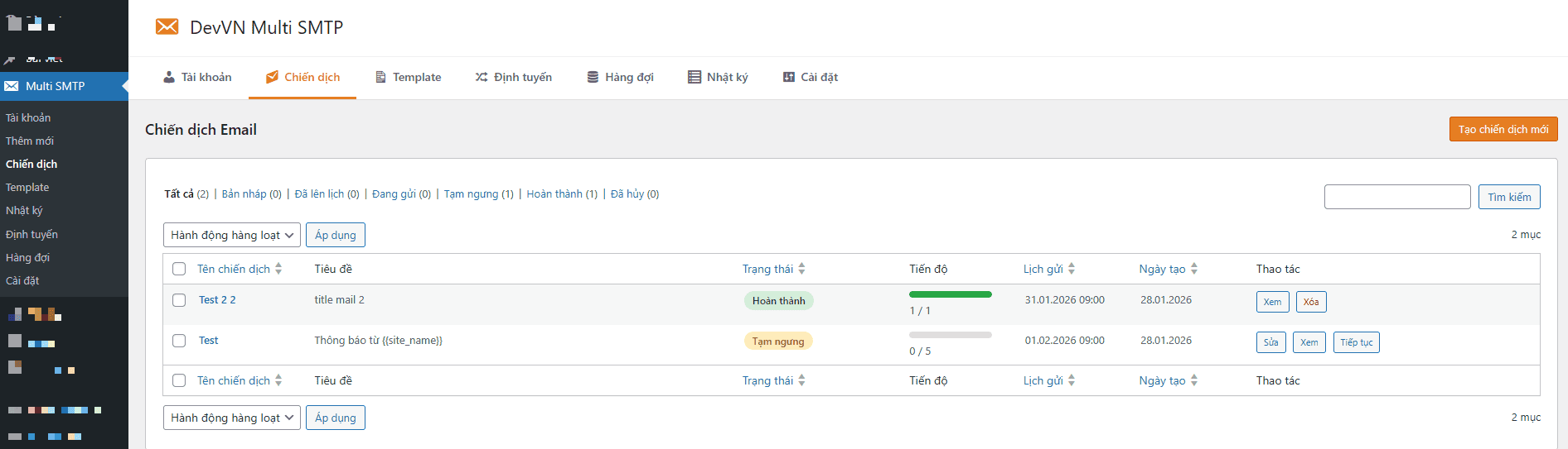 Không cần tốn tiền mua thêm dịch vụ Email Marketing bên ngoài. DevVN Multi SMTP tích hợp sẵn trình quản lý chiến dịch: