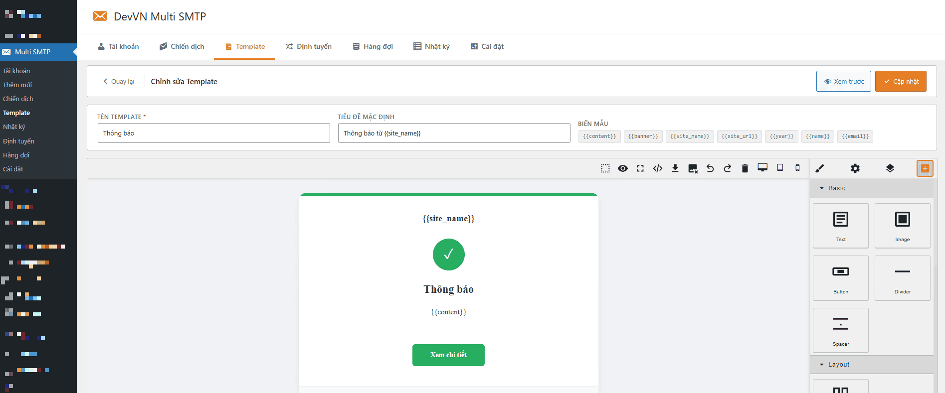 - Hỗ trợ các biến động (Template variables) như {{name}}, {{email}}.