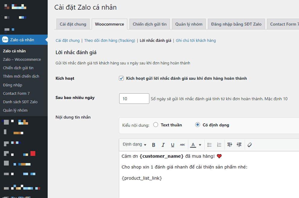 Khi bạn sử dụng 1 trong các plugin vận chuyển cho Woo của tôi. Plugin sẽ có thêm các cài đặt tương ứng để có thể gửi tin nhắn thông báo cho khách khi đơn hàng được đăng thành công sang các bên vận chuyển
