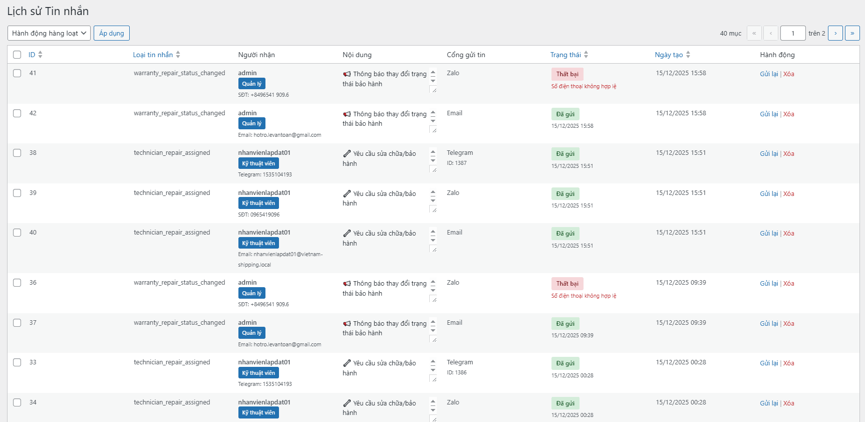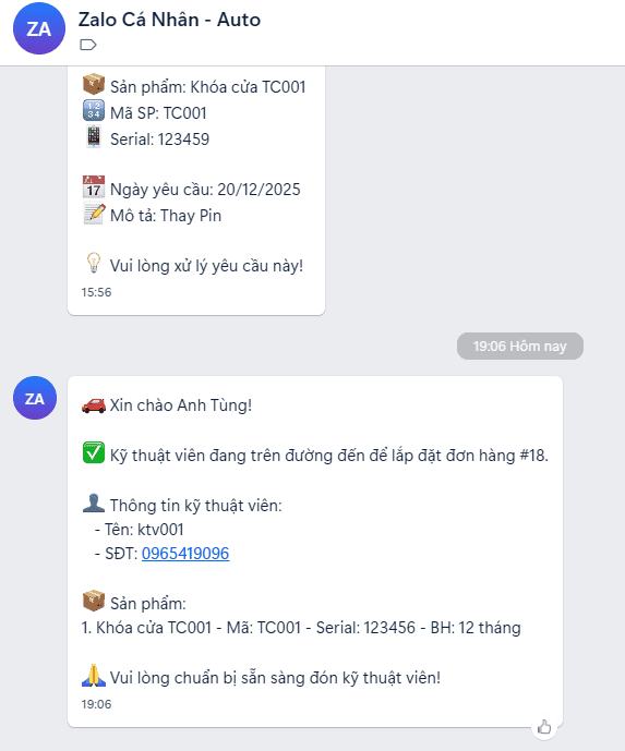 Thông báo cho nhân viên hoặc khách hàng thông qua zalo thông qua Zalo cá nhân khi tạo đơn, thay đổi trạng thái đơn, bảo hành