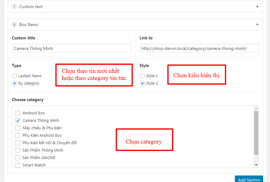 + Thêm phần tin tức tại trang chủ. Có thể chọn hiển thị theo tin tức mới nhât hoặc theo category tin tức cụ thể và có 2 giao diện để lựa chọn